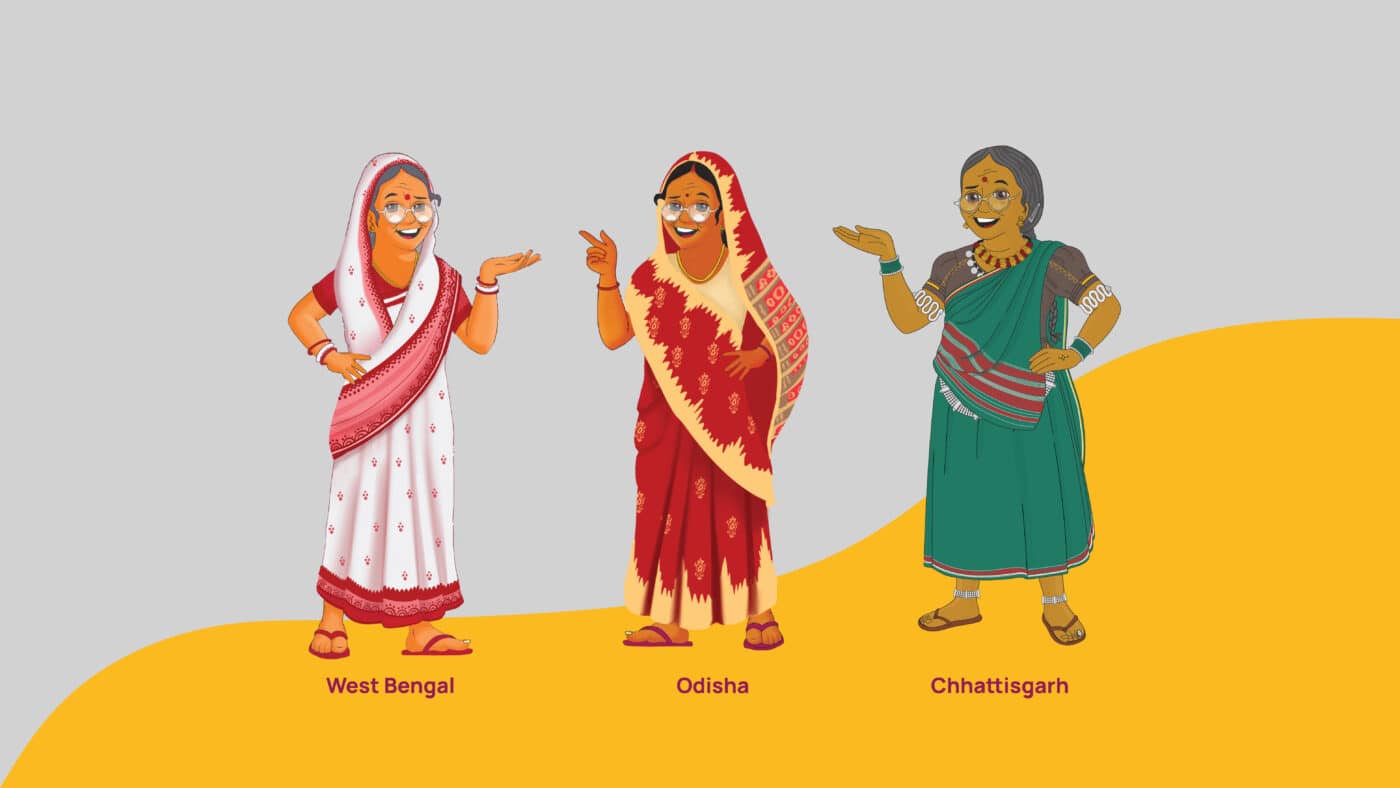 Kaki from West Bengal, Odisha and Chhattisgarh, each reflecting local identity and connecting with communities through a shared message on timely eye check-ups
