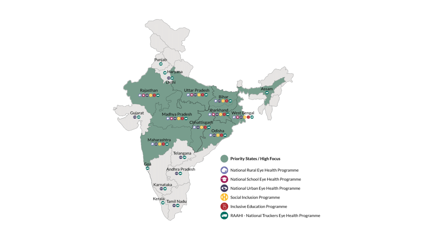 Priority States also known as High Focus states were identified by Sightsavers India as being the least developed and with the greatest need for eye health care in the country. The Priority States consists of Assam, Bihar, Chhattisgarh, Jharkhand, Madhya Pradesh, Maharashtra, Odisha, Rajasthan, Uttar Pradesh and West Bengal. These ten states are intensively engaged at District and State Level to bring about change. The intensive engagement for Eye Health, Inclusive Education and Social Inclusion are carried out in the mentioned states.